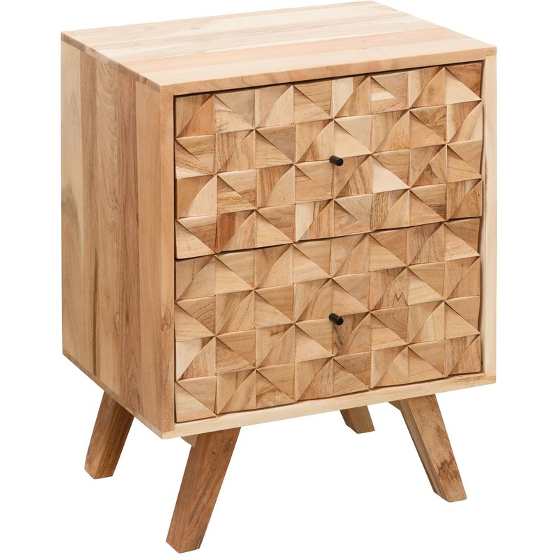 FineBuy Nachtkästchen Akazie Massivholz – Nachttisch mit 2 Schubladen, handgefertigt mit 3D Schnitzereien Nachtkommode geeignet für Boxspringbetten 44x35x61cm