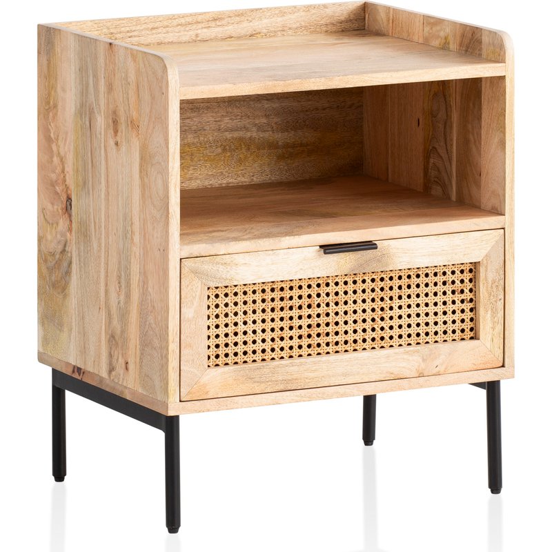 FineBuy Nachtkonsole Mango Massivholz Rattan – Nachttisch im Boho Natur Design mit Schublade & offener Ablage, Nachtkästchen ideal für Boxspringbetten – Wiener Geflecht 50x60x40 cm
