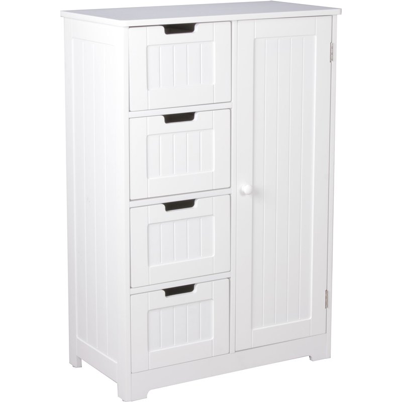 Design • Weißer Badschrank im Landhausstil • Klassische und schlichte Kommode • Vier Schubladen und ein Stauraumfach • Stilvolle Einkerbungen als Schubladengriffe