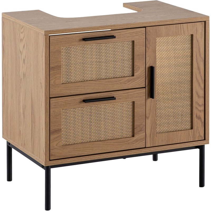 Material • Badschrank: folierte Spanplatte in Eichenoptik • Griffe und Gestell: pulverbeschichtetes Eisen • Geflecht: Polyrattan