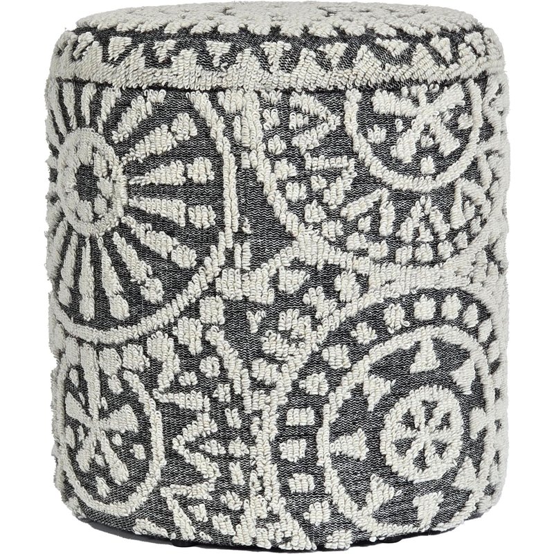 Design • Runder Sitzhocker in modernem Boho Stil • Hochwertiger Bezug aus weicher Wolle • Elegantes Grau-Weiß-Muster mit zeitloser Ausstrahlung • Kreisstruktur um den Hocker herum als dekoratives Detail