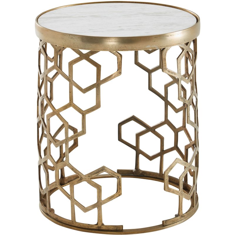 Design • Runder Beistelltisch in modernem Design • Tischplatte mit edler Marmorstruktur • Offen und extravagant gestaltetes Gestell • Harmonische Farbkombination aus Weiß und Gold