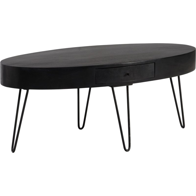 FineBuy Couchtisch 100cm oval Mango Massivholz schwarz · Wohnzimmertisch mit Schublade und Hairpin Beinen · Moderner Massivholztisch im Industrial Design mit Metallgestell