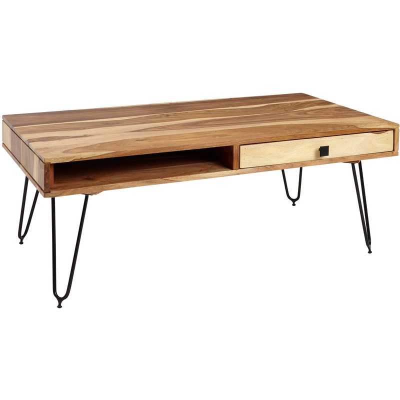 FineBuy Couchtisch Massivholz 110 cm · Industrial Wohnzimmertisch rechteckig mit Hairpin Beinen, 2 Schubladen & Ablagefächern · Handgefertigt