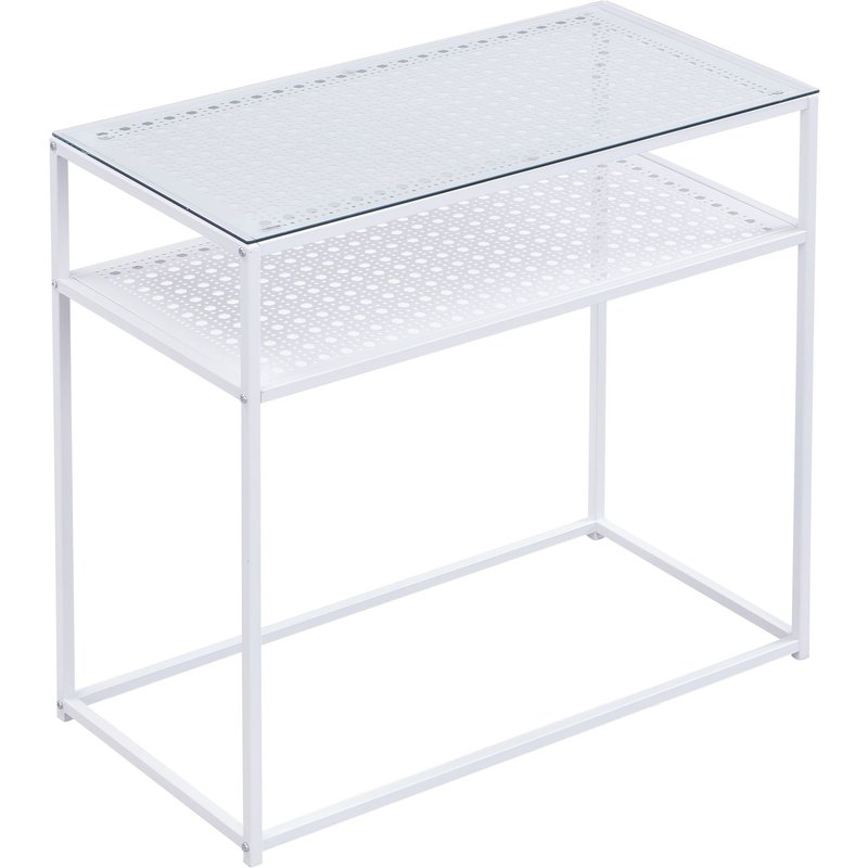 Design • Moderner Konsolentisch mit klaren Linien • Rechteckige Glasplatte für elegante Optik • Stilvolle Gitterstruktur unterhalb der Tischplatte und auf der Ablage als dekoratives Detail • Schlanke Form – ideal für Flur, Eingangsbereich oder Wohnzimmer