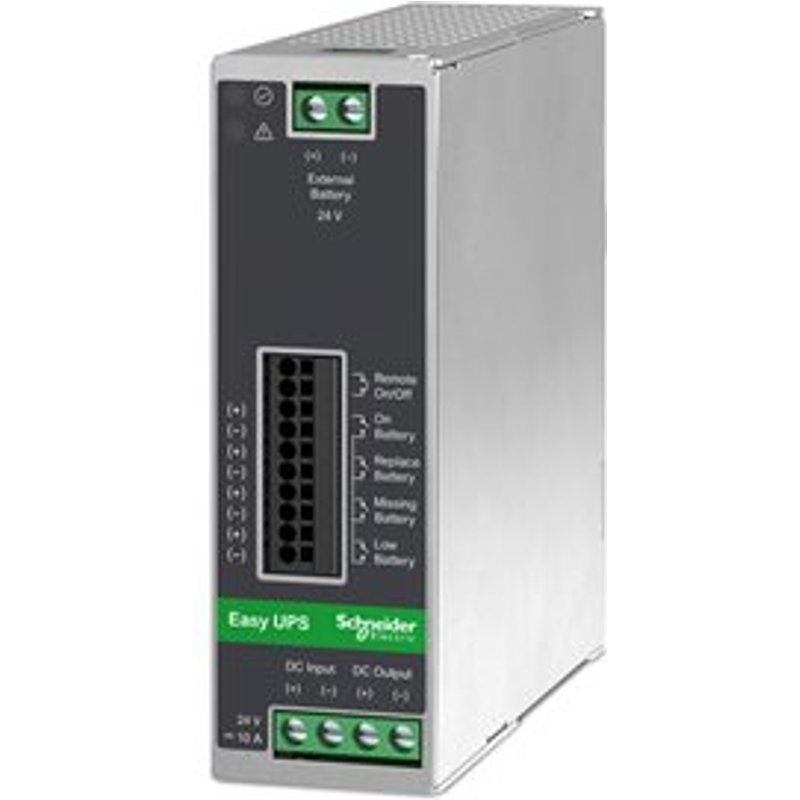 APC Easy UPS UPS DIN rail mountable 10A DC 24V 240Watt no battery output connectors 1metal gray. Die Industrie-USV 24V DC DIN Schiene ist ein Teil der Easy UPS Familie von Schneider Electric. Bei diesem Modell handelt es sich um eine 240W-USV mit Gleichstromeingang und Gleichstromausgang zur Unterstützung von Industrieanlagen. Es verfügt über 0-5V-Signalrelaiskontakte, Unterstützung für bis zu 4 externe Akkus, LED-Anzeigen und EPO-Schalter für eine bessere Kontrolle über die industrielle Steuerungsinfrastruktur. Sie wird mit einer 2-jährigen Standardgarantie geliefert.