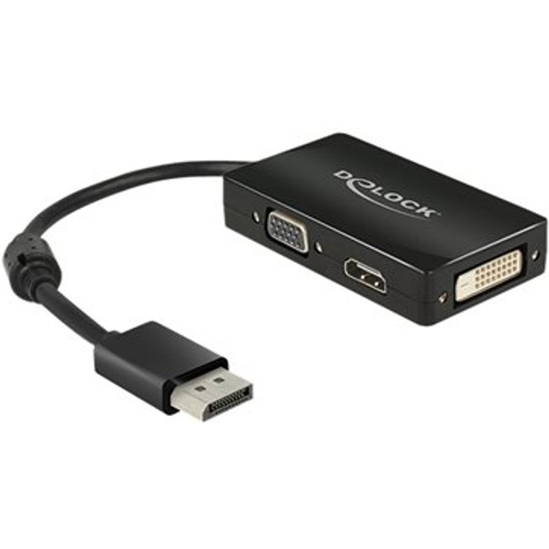 DELOCK Adapterkabel DisplayPort Stecker > 1 x VGA + 1 x HDMI + 1 x DVI 24+1 schwarz. Mit diesem Displayport Adapter von Delock können Sie Ihr System um eine VGA, HDMI und DVI Schnittstelle erweitern und verschiedene Geräte, wie z.B. Fernseher, Projektor, PC Monitor etc. anschließen. Es kann nur ein Monitor am Adapter betrieben werden, nicht mehrere gleichzeitig.