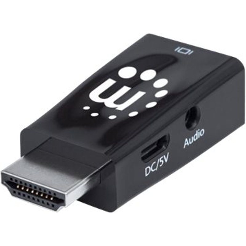 MANHATTAN HDMI auf VGA-Mikrokonverter mit Audio, optionaler USB Micro B-Stromport HDMI-Stecker auf VGA-Buchse schwarz. Der Manhattan HDMI auf VGA-Mikrokonverter ermöglicht den Anschluss eines PCs, Notebooks oder anderen Mediengeräts mit HDMI-Port an einen Bildschirm oder Beamer mit VGA-Port. So können Sie auch ältere Displays noch mit modernen HDMI-Geräten nutzen. Durch die zusätzlich enthaltene Audioverbindung mit Klinkensteckern können Sie über den Konverter auch Audio an ein externes Gerät ausgeben.