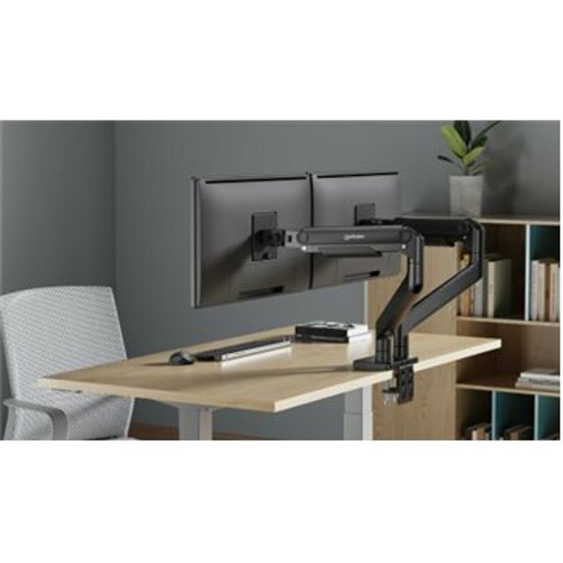 MANHATTAN Tischhalterung mit mechanischer Feder zwei Gelenke für zwei Monitore 43,18-114,30cm 17-45Zoll und bis zu 20 kg/Monitor. Die verstellbaren Doppelarme des Manhattan-Montagesatzes bieten eine flexible Positionierung für gebogene oder flache Bildschirme von 17 bis 45 Zoll. Diese aus Aluminium gefertigte Montagelösung ist auf Stabilität und Benutzerfreundlichkeit ausgelegt und verfügt über ein Kabelmanagementsystem, das für Ordnung am Arbeitsplatz sorgt. Mit einem maximalen Belastungsgewicht von 20 kg und mehreren Befestigungsoptionen, darunter eine Tüllenhalterung und ein Tischklemmsockel, ist diese Halterung vielseitig für verschiedene Installationsanforderungen geeignet. Der Neigungsbereich von -20° bis 50° und die 360°-Drehung machen es einfach, den perfekten Blickwinkel zu finden, und erhöhen den Komfort und die Produktivität in jeder Umgebung.