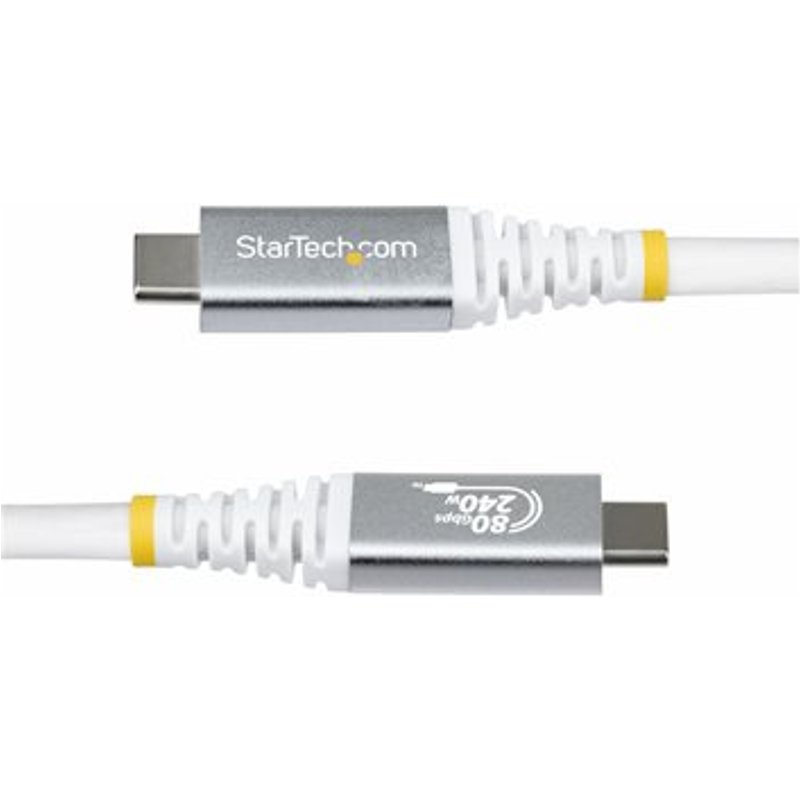 STARTECH.COM 1m USB4 Kabel 80Gbps USB-IF-zertifiziertes USB-C Ladekabel 240W 8K 120Hz-4K 240Hz DP2.1monitorkabel Thunderbolt 4 Weiss. Verwenden Sie dieses USB-IF-zertifizierte USB-C-Kabel für schnelle und zuverlässige Verbindungen zu Ihren USB4-Geräten Zuverlässige Verbindung zu USB Type-C (USB4), Thunderbolt und PCIe-fähigen Geräten mit bis zu 80Gbps, 8K/4K-Video und 240W Power Delivery. Jeder Stecker ist lasergraviert mit den USB4 Spezifikationen - ein exklusives Merkmal, das Rätselraten ausschließt, Kompatibilität bestätigt und volle USB4-Leistung verifiziert. Leistungsstarke Laptops mit Strom versorgen Leistungsstarke Laptops und USB-C Geräte sicher mit bis zu 240W Extended Power Range (EPR) Power Delivery 3.1 versorgen - über eine kompatible USB-C Dockingstation oder ein USB-C Wandladegerät. Ein integrierter E-Marker-Chip sorgt für eine präzise Leistungsregelung und ein stabiles, konstantes Laden. Ideal für professionelle Laptops wie Apple MacBooks mit M-Serie Pro oder Max. Zertifiziert für zuverlässige Leistung Volle USB4-Leistung mit einem USB-IF-zertifizierten Kabel, das für anspruchsvolle Anwendungen in den Bereichen Stromversorgung, Datenübertragung und Display entwickelt wurde. Es wird strengen elektrischen und mechanischen Tests unterzogen und garantiert zuverlässige Interoperabilität, Signalqualität und einen stabilen Betrieb mit einer Vielzahl von USB-C-Geräten. Das USB4-Kabel verfügt über geschirmte 30/34AWG-Koaxialleiter für optimalen EMI-Schutz. Erleben Sie 8K-Video mit 120Hz über DisplayPort 2.1 Alt Mode Erleben Sie gestochen scharfes 8K-Video mit 120 Hz oder zwei 4K-Displays mit 120 Hz über DisplayPort 2.1 Alt Mode mit DSC, HBR3 und HDR10+-Unterstützung. Ideal für professionelles 3D-Rendering, hochfrequente Videoausgabe und bandbreitenintensive visuelle Workflows. Dieses USB4 Kabel lässt sich nahtlos mit USB-C oder Thunderbolt 4 Dockingstationen integrieren und bleibt abwärtskompatibel mit einer Vielzahl von Auflösungen und Bildwiederholraten. Die 1 Meter lange Kabellänge eignet sich ideal für Schreibtisch-Workstations und mobile USB-C-Monitore.