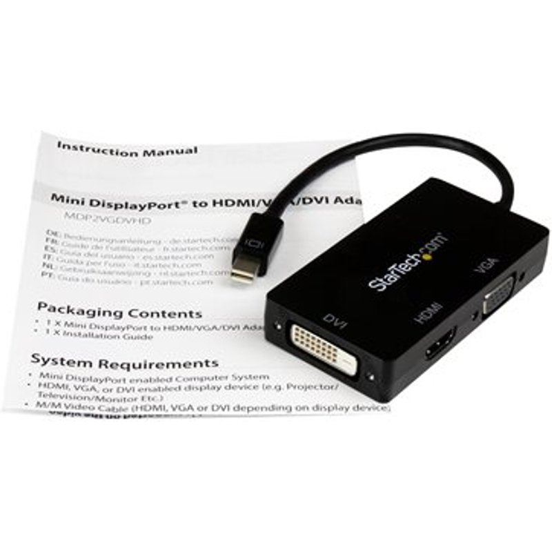 STARTECH.COM Travel A/V Adapter 3-in-1 Mini DisplayPort to VGA DVI or HDMI Converter. Mithilfe dieses Reiseadapters können Sie ein mDP-fähiges Ultrabook oder Laptopcomputer an jedes VGA- oder HDMI -Display anschließen. Durch gründliche Tests wird die Kompatibilität des 3-in-1-Mini-DisplayPort-Adapters gewährleistet und er ist das perfekte Zubehör für alle Ihre Microsoft Surface Pro-Geräte, die mit mDP ausgestattet sind.