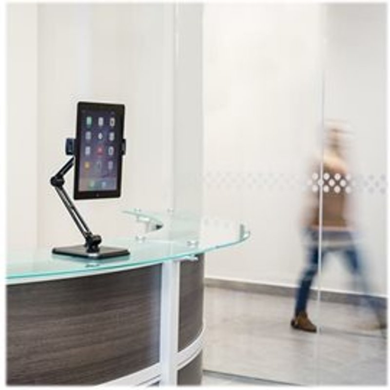 STARTECH.COM Tablet Stand Universal iPad Stand for 4.7in to 12.9in Tablets iPad Holder Wall Mount Tablet Holder. Integrieren Sie mit dieser universellen Tablet-Halterung Ihr iPad oder ein anderes Tablet nahtlos in Ihren Arbeitsplatz. Bewegen Sie die Tablet-Halterung nach oben oder unten und drehen Sie das Tablet, um Ihre Betrachtungsposition im Handumdrehen anzupassen. Der Tablet-Ständer steht sicher auf Ihrem Schreibtisch. Sie können ihn jedoch auch an der Wand oder auf der Unterseite eines Schranks befestigen. Maximieren Sie die Nutzung Ihres Tablets Mit diesem hochgradig anpassbaren Tablet-Ständer können Sie die Nutzung Ihres Tablets maximieren. Dabei müssen Sie es weder in der Hand halten noch auf Ihrem Schreibtisch ablegen. Verändern Sie mühelos Ihren Blickwinkel Bewegen Sie einfach die Tablet-Halterung mit den zwei beweglichen Gelenken nach oben oder unten, um Ihr Tablet in der richtigen Höhe zu positionieren. Die Tablet-Halterung ist +170° am Standfuß sowie -40°/+180° am Gelenk drehbar und ermöglicht so die einfache Einstellung der Tablet-Position. Wechseln Sie mit der 360°-Drehung einfach von Hochformat auf Querformat. Problemloser Einbau Die Klemme wird einfach auseinander gespreizt, um ein 4,7-Zoll bis zu 12,9-Zoll großes und bis zu 1-kg schweres Tablet oder Telefon aufzunehmen. Mit dem großen Standfuß steht der Tablet-Ständer sicher auf Ihrem Schreibtisch, Ihrer Theke oder jeder anderen flachen Oberfläche. Für eine Vielzahl von Anwendungen umfasst der Lieferumfang zudem einen kleineren Fuß. Damit können Sie den Tablet-Ständer an einer Wand oder an der Unterseite eines Arbeits- oder Küchenschranks befestigen. Das System ARMTBLTDT wird von StarTech.com mit einer Garantie von 3-Jahren sowie mit einem kostenlosen technischen Support für die gesamte Produktlebensdauer angeboten.