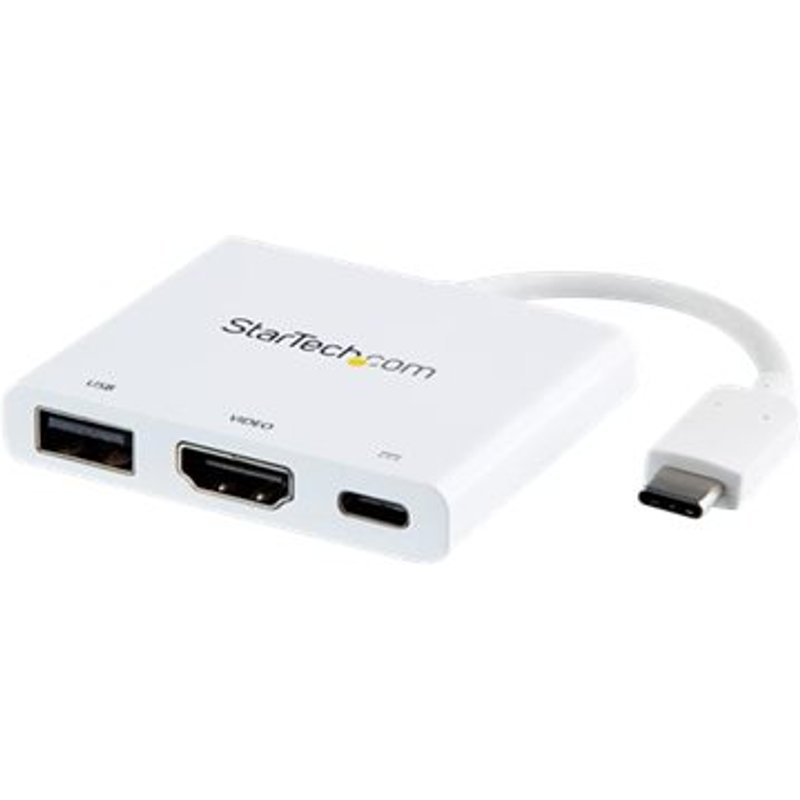 STARTECH.COM USB-C auf HDMI Adapter - Weiss - 4K 30Hz - Thunderbolt 3 kompatibel - mit Power Delivery USB PD - USB C Dongle. Mit diesem USB-C -Multiport-Adapter mit HDMI können Sie wichtige Verbindungen zu Ihrem MacBook oder Windows-Laptop über einen einzigen USB-C-Anschluss herstellen. Schließen Sie einen UHD-4K-HDMI-Monitor an Schließen Sie Ihren USB-C- oder Thunderbolt-3-Laptop mit diesem USB-C-zu-4K-HDMI-Adapter an einen 4K-Monitor mit 30-Hz an, um maximale Produktivität zu erzielen. Sie können auch eine Verbindung zu einem HDMI-Projektor oder -Fernseher in einem Konferenzraum oder einem anderen Sitzungssaal herstellen, um Präsentationen auf einem gemeinsamen Bildschirm zu präsentieren. Laden Sie Ihren Laptop auf Der USB-C-Adapter ermöglicht während einer Präsentation oder während der Arbeit die Stromversorgung und das Aufladen Ihres USB-C-Laptops mit einem USB-C-Anschluss mit Power Delivery. Auch wenn Ihr Laptop nur über einen einzigen USB-C-Anschluss verfügt, wird der Laptop weiterhin mit Strom versorgt. Hinzufügen eines USB-3.0-Anschlusses Dieser USB-C-Multiport-Adapter bietet einen USB-3.0-Anschluss, der abwärtskompatibel mit älteren USB-Geräten ist - ideal zum Übertragen von Daten, Synchronisieren oder Aufladen von Mobilgeräten. Reisetaugliches Design Der kompakte All-in-one-Adapter ist ein wichtiges Zubehör für Ihren USB-C-Laptop. Mit seinem kompakten Design können Sie das Gerät überallhin mitnehmen, wo Sie Ihren Laptop verwenden würden. Das CDP2HDUACPW wird von StarTech.com mit einer 3-Jahres-Garantie sowie lebenslangem kostenlosem technischem Support angeboten. Hinweis: Um eine vollständige Adapterfunktionalität zu gewährleisten, muss der USB-C-Port Ihres Laptops USB Power Delivery und den DP-Alt-Modus unterstützen.